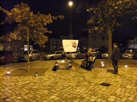 Es ist Freitag, der neunte November. Die Sonne verschwindet langsam hinterm Horizont. Das Trave-Piraten-Banner wird auf dem Schlutuper Markt gehisst. Einige Laternen erhellen den Platz. Langsam füllt sich der Markt mit Leuten. Immer mehr Kinder melden sich an dem extra aufgestellten Tisch. Sie erhalten einen Stift und einen Zettel mit den wichtigsten Informationen für die abendliche Mission. Fast 50 Kinder mit ihren Begleitern werden so mit den nötigen Werkzeugen ausgestattet. Mit Taschenlampen bewaffnet und sicherer Kleidung gibt es von Piratenbraut Julia noch die letzten Anweisungen. Dann kann es losgehen.