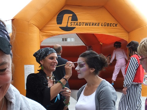 Mit Hüpfburg, Kinderschminken und Button-Maschine bezogen wir Stellung, um unsere Freunde von der Brockensammlung